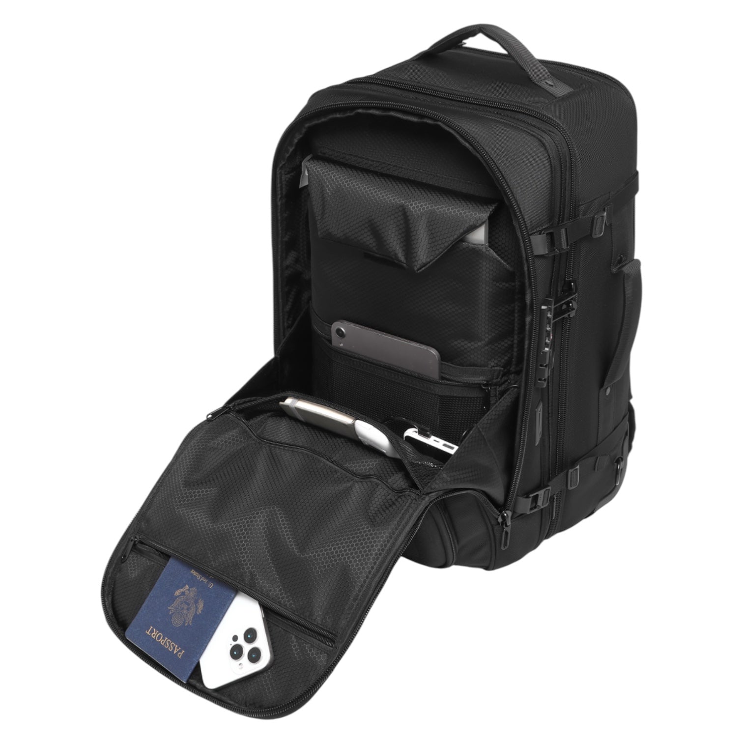 Security is built directly into the design with a double-sided, TSA-approved combination lock that secures both the main compartment and the padded laptop compartment, helping protect valuables throughout travel.